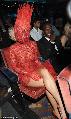 As well as her trademark futuristic leotards, the 'Pokerface' singer who arrived at the show with Miss Piggy's paramour, Kermit the Frog, donned a number of bizarre ensembles for her moment in the spotlight, notably a red lace mini dress with matching mask and headdress. As she stepped onstage to accept her award from rapper Eminem it was clear that underwear was not one of the priorities for her wardrobe, as she failed to wear a bra underneath the revealing dress.